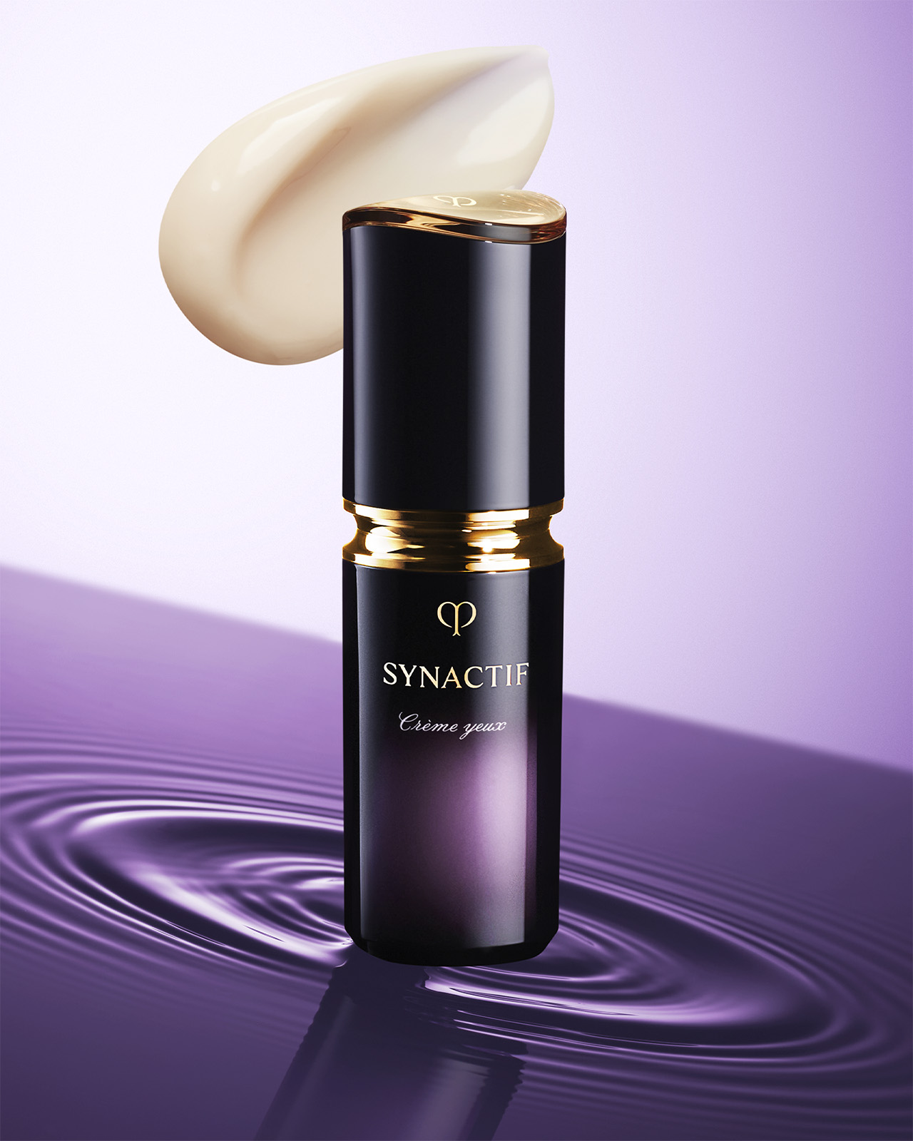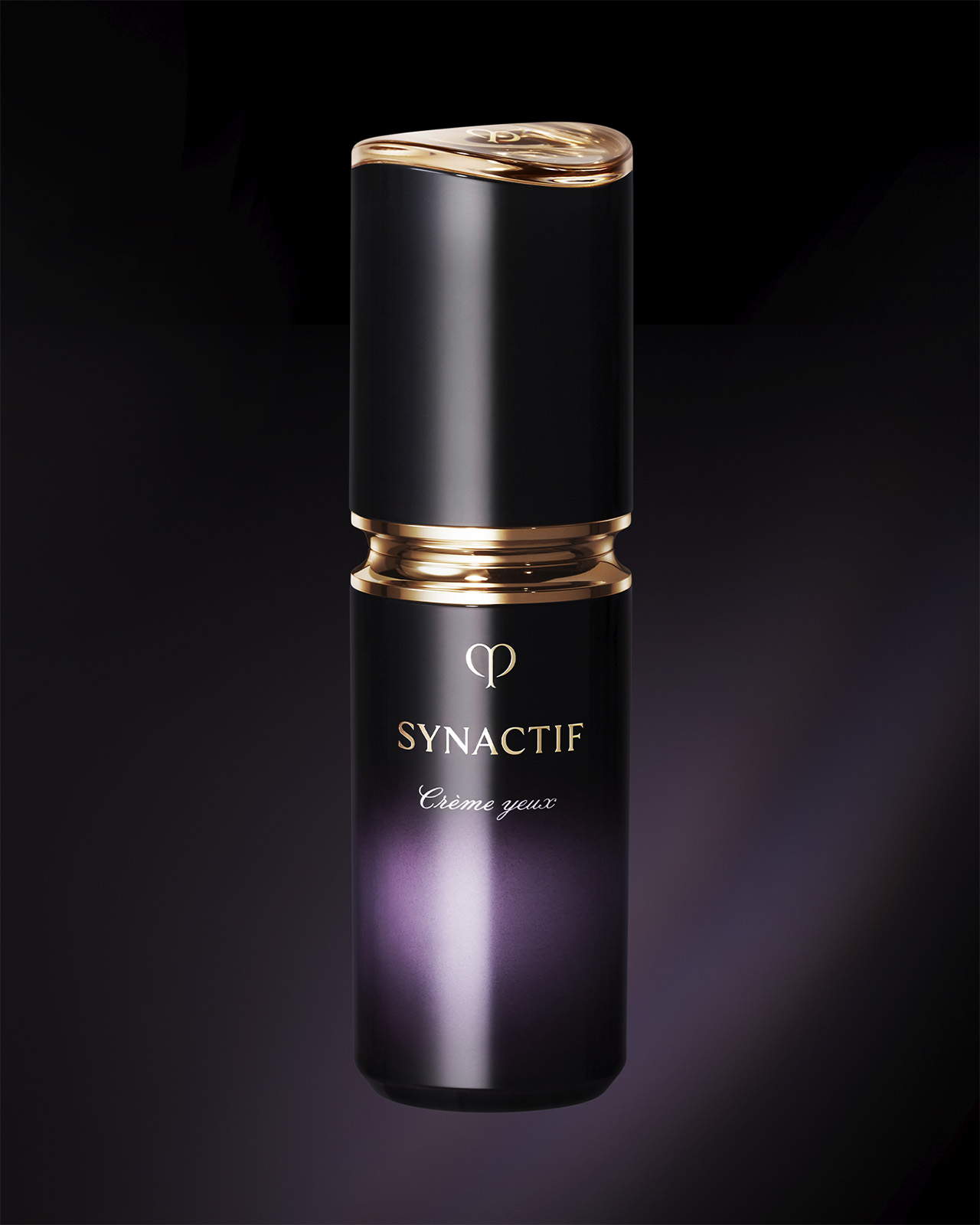 Photo of the Clé de Peau Beauté SYNACTIF EYE CREAM. It is housed in a compact cylindrical bottle featuring a black-to-purple gradient. A gold accent is placed between the cap and body, and the 'SYNACTIF' logo is displayed on the front.